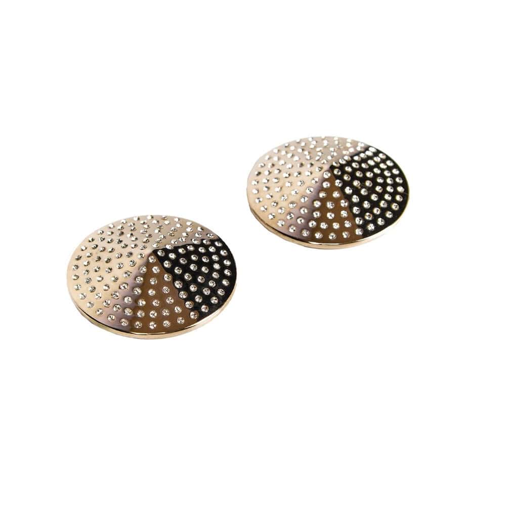 Les cache-tétons dorés strassés incarnent l’éclat du plaisir. Sculptés en métal doré poli et rehaussés de cristaux scintillants, ils attirent la lumière à chaque mouvement. Portés nus ou sous un tissu transparent, ils transforment la poitrine en œuvre d’art, entre sensualité et audace.