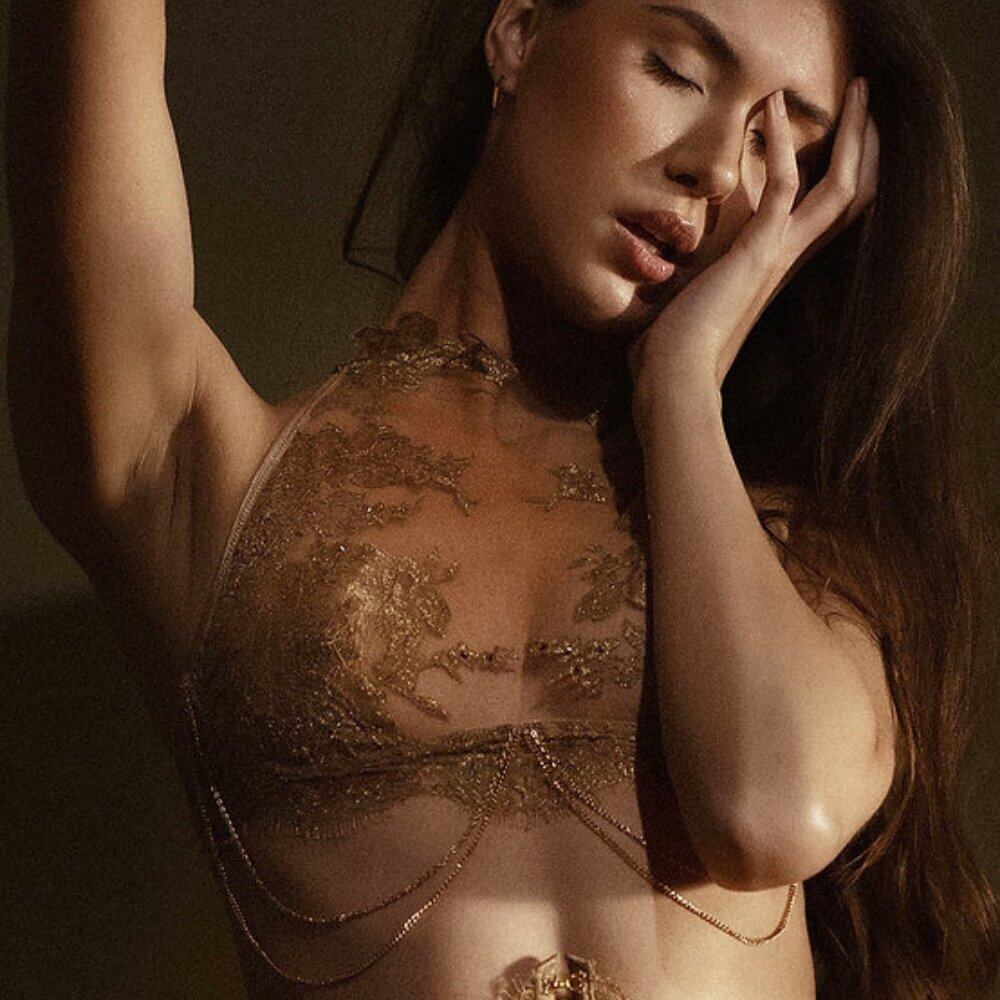 Le soutien-gorge long AIMÉE est une pièce artisanale, fabriquée à la main à partir d’une maille illusion ultra-transparente teinte à la main et de la plus belle dentelle Leavers française en or rosé. Chaque motif de dentelle est coupé à la main et placé de manière unique, apportant un éclat subtil et lumineux à votre peau. Orné de cristaux scintillants et de chaînes amovibles en or, ce modèle offre une finition précieuse, semblable à un bijou.