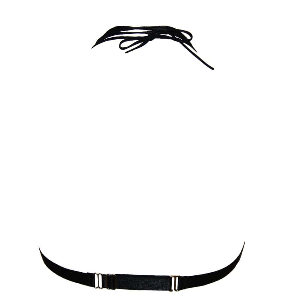 Le soutien-gorge souple Pothos joue avec deux couches de tulle noir délicatement croisées. Un élastique spaghetti se noue derrière la nuque pour une silhouette épurée et ajustée, tandis que les anneaux métalliques argentés apportent une touche brillante, subtilement espiègle.