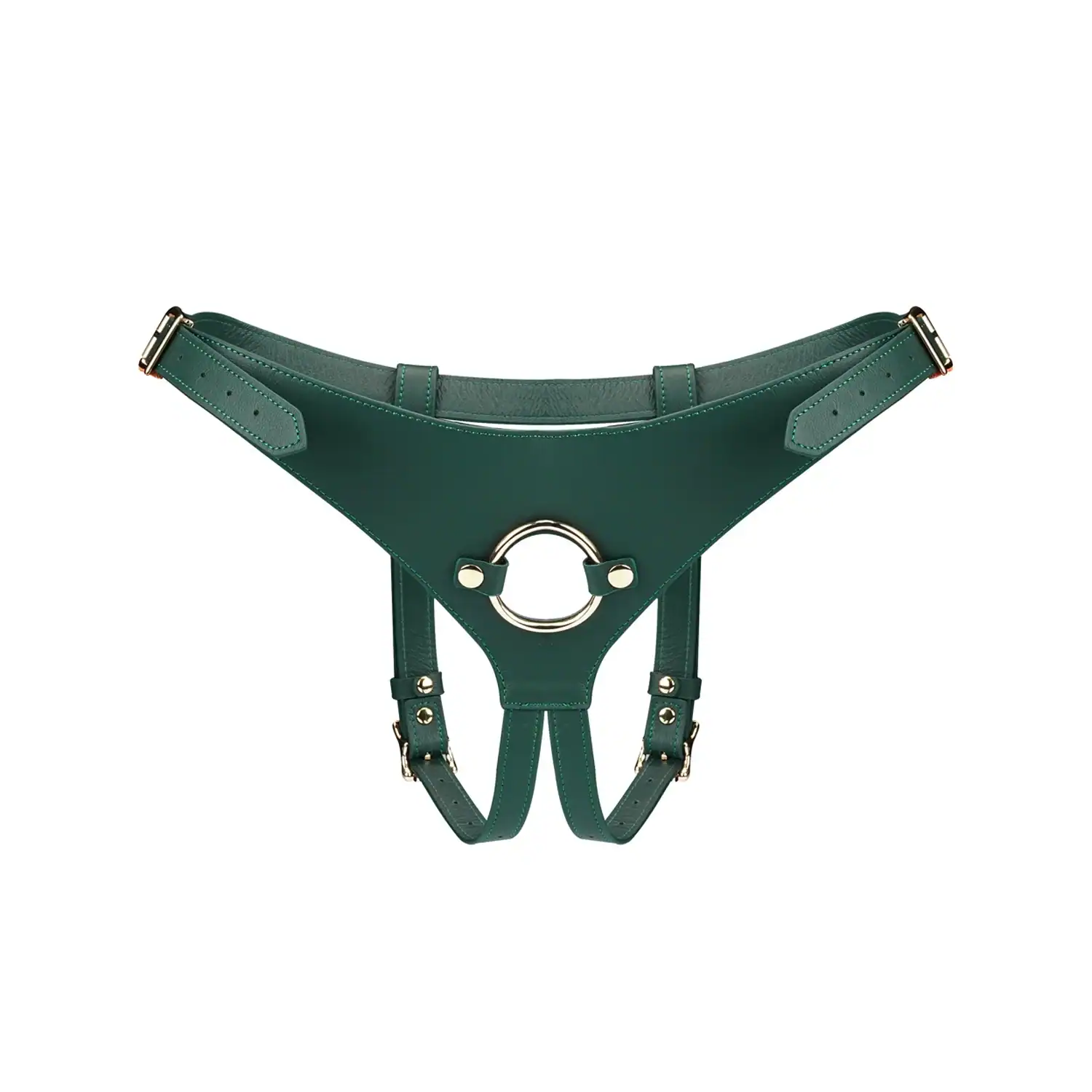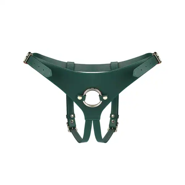 Ce harnais Mossy Chic transforme instantanément vos jeux de rôle ou vos séances de domination. Réalisé en cuir véritable vert profond, il assure un maintien solide et confortable. Son anneau frontal de 3.8 cm permet de fixer la plupart des dildos compatibles, qu’ils soient souples, fermes, simples ou vibrants.