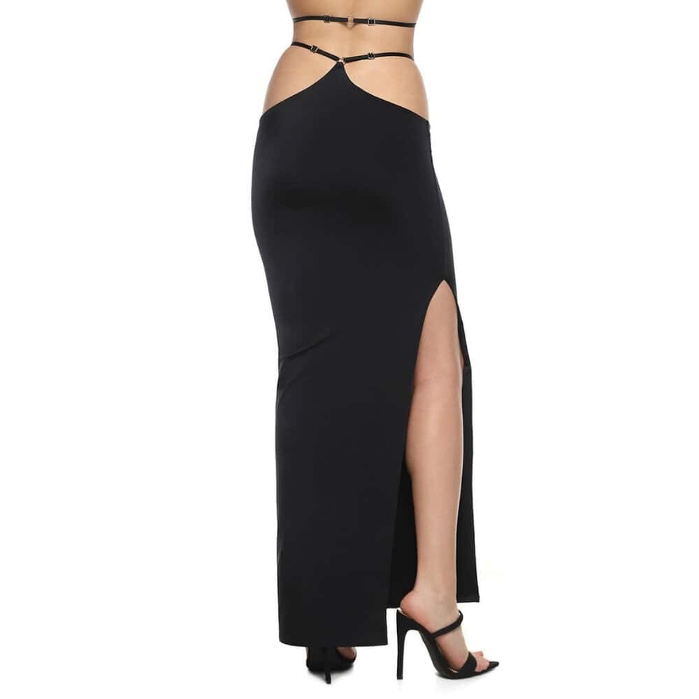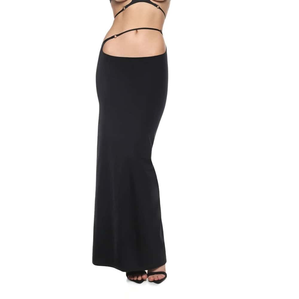 Rock aus doppeltem Biflex, fließend und dehnbar. Der mit Metallringen verzierte Rock hat einen hohen Schlitz, der je nach gewünschtem Effekt an der Seite oder im Rücken getragen werden kann. Passend zum top StellareSie lässt sich auch gut mit anderen Stücken kombinieren.