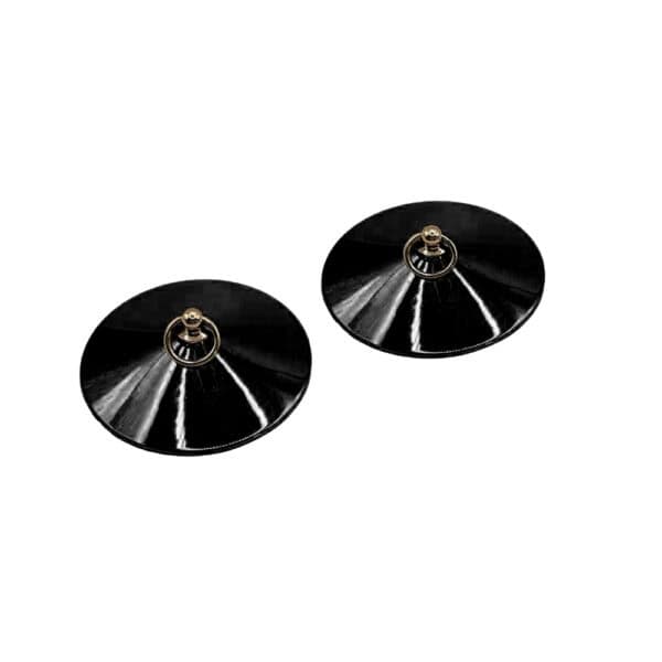 Die schwarzen Übertöpfe mit Ringen vereinen Eleganz und Kühnheit. Sie bestehen aus schwarzem, poliertem Metall und sind mit einem goldenen Mittelring verziert, der die Blicke auf sich zieht und zur Kreativität einlädt. Dieser Farbkontrast betont die Haut und verstärkt die visuelle und taktile Kraft des Stücks.