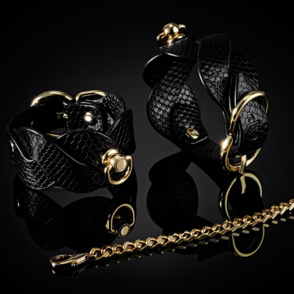 Durch eine goldene Kette verbunden, symbolisieren sie Verbindung, Vertrauen und Kontrolle. Die verstellbaren Schnallen ermöglichen eine präzise Anpassung für längeres Tragen ohne Beschwerden. Ein ebenso schönes wie effektives Accessoire, perfekt für einen stilvollen Einstieg in den BDSM.