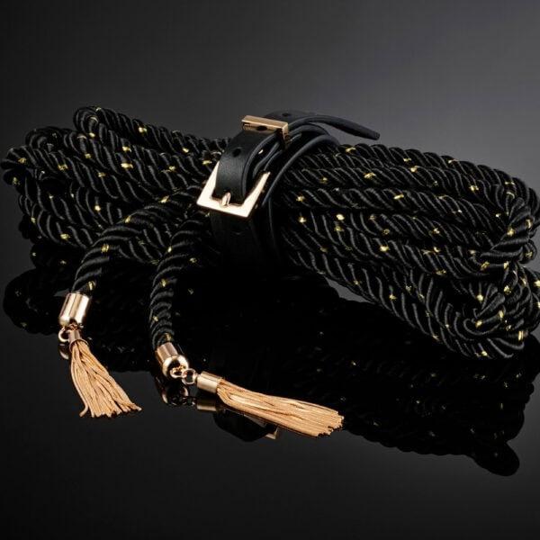 The rope is designed to sublimate the art of bondage and shibari. Seven meters long, it's made of soft braided cotton, interlaced with light-catching golden threads that add a touch of glamour to every knot.