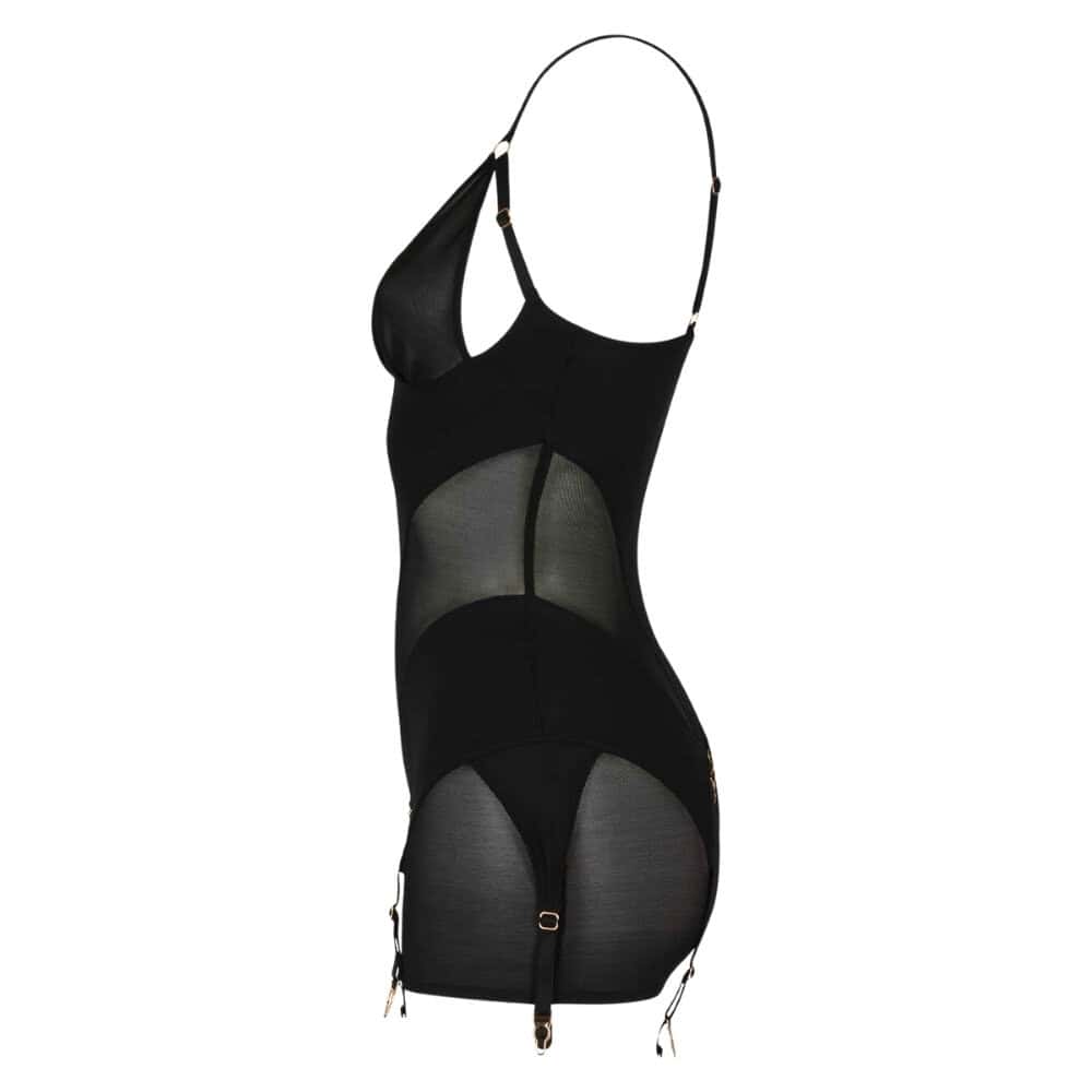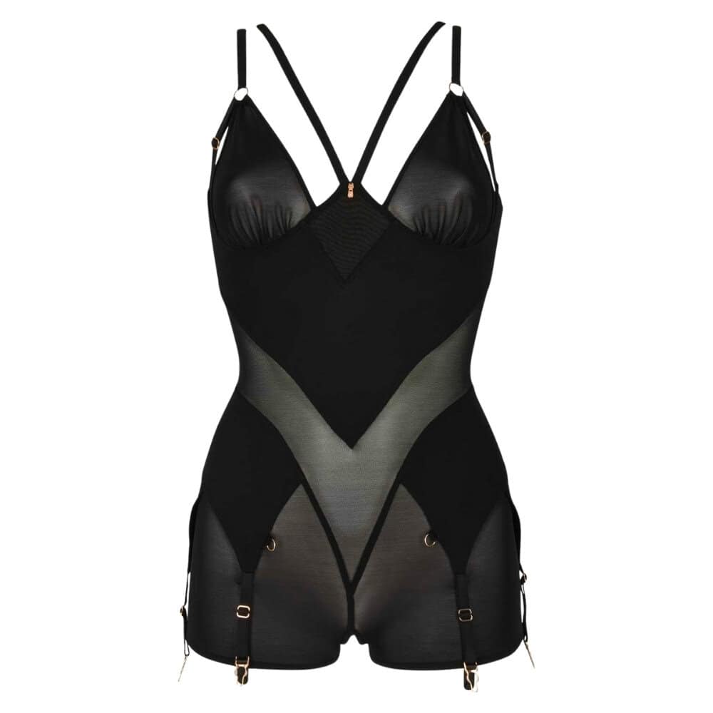 Fishnet zones on the bust, tummy, upper thighs and buttocks draw a subtle veil over the skin. Under the bust, a slight gathered effect adds relief and femininity. The model features six adjustable garters to secure your stockings and triple straps at bust level for adjustable support.