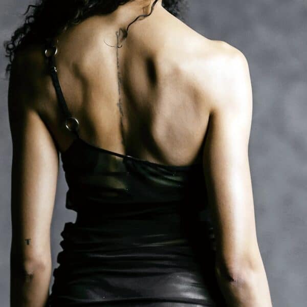 Top Les Indolentes de Gonzales BusinessConfeccionado en tul negro con bandas elásticas en el escote, este top de escote asimétrico está totalmente fruncido. Los anillos plateados adornan esta prenda tan actual.