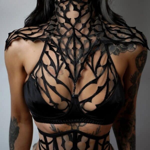 Este peto de la colección Dogma está confeccionado a mano con tul nude bordado con motivos negros inspirados en las vidrieras góticas. Se ciñe al cuello y los hombros con un corte alto, acentuado por un colgante ornamental de metal y resina en el centro del escote.