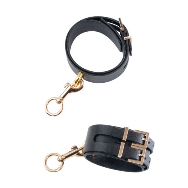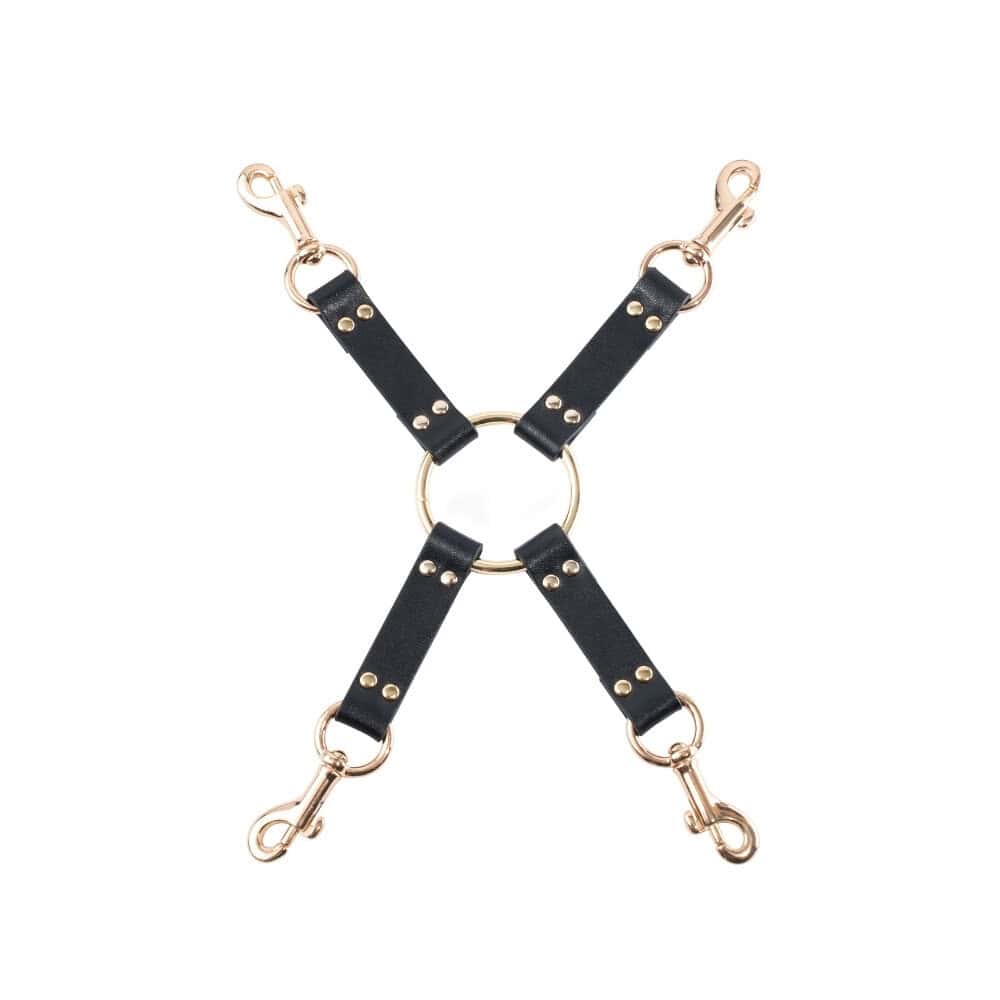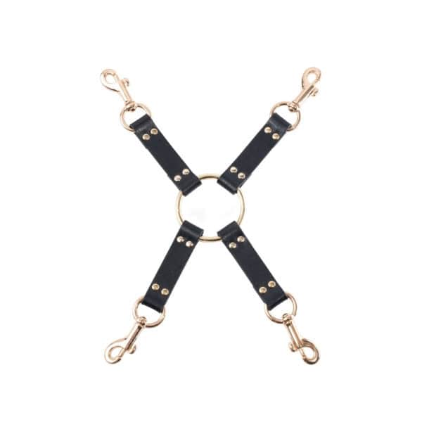 В набор входит центральный позолоченный металлический коннектор, украшенный основным кольцом и четырьмя поворотными защелками, а также два наручника для запястий и два наручника для лодыжек с двойной петлей. Все вместе они позволяют обездвижить партнера в позе хогти - символе абсолютного подчинения и полного доверия.