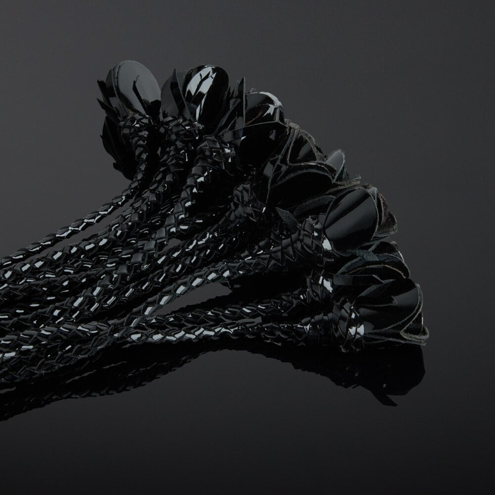 Выполненная из лакированной кожи глубокого черного цвета, она украшена букетом из двенадцати плетеных ремешков, каждый из которых украшен кожаной розой.