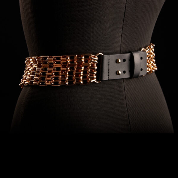 Пояс Aria Jewellery Belt носится как украшение от кутюр. Тщательно обработанные золотые звенья в сочетании с регулируемой застежкой из кожзаменителя создают аксессуар, находящийся между ювелирным делом и модой. Созданный как украшение для талии, он притягивает свет и подчеркивает силуэт с силой и утонченностью.