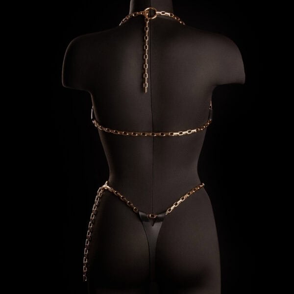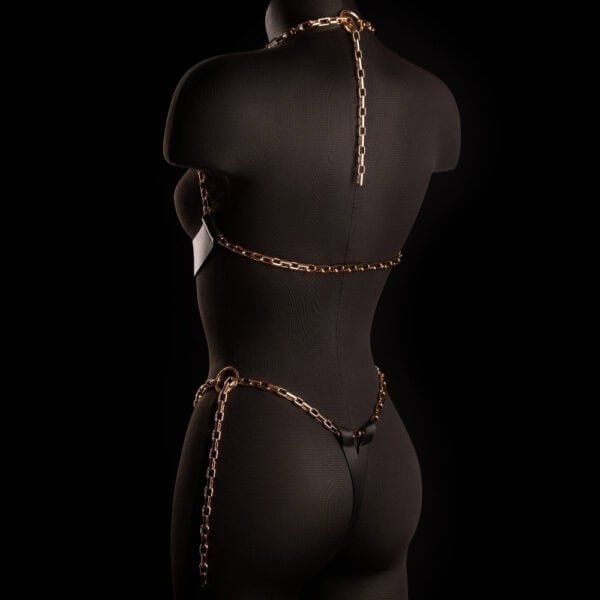 Золотые цепочки по бокам придают чувственность и скульптурность, а спереди украшены фирменной золотой эмблемой IINFYNII. На бедре незаметное кольцо-защелка обеспечивает легкую и функциональную посадку.