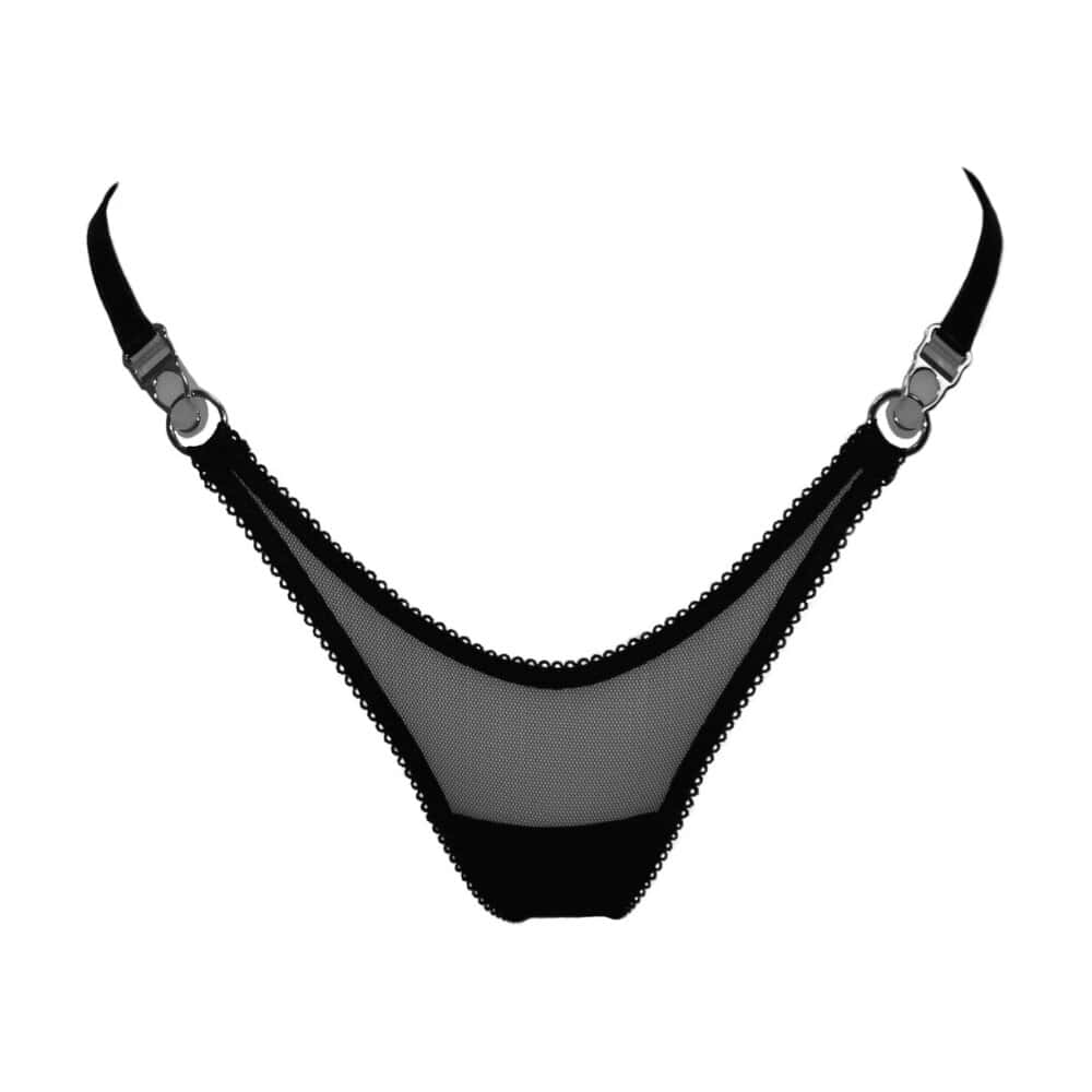 Классическая форма, переосмысленная в духе Lethe: трусики-стринги Kallisti играют в светлую карту с помощью полупрозрачной черной сетки, украшенной эластичным пико и серебряными кольцами. Боковые стороны полностью регулируются для безупречной поддержки.
